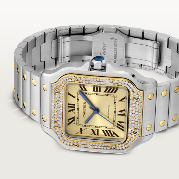 Santos watch, medium model, Manufacture mechanical movement with automatic winding, caliber 1847 MC. Steel case, yellow gold 750/1000 bezel set with 206 brilliant-cut diamonds totaling 0.64 carats.7-sided crown set with a faceted synthetic spinel, golden sunray dial, blued-steel sword-shaped hands, sapphire crystal. Steel bracelet with "SmartLink" adjustment system. Second strap in alligator leather, interchangeable steel deployant buckle. Both bracelets are fitted with the "QuickSwitch" interchangeability system. Case width: 35.1 mm, thickness: 8.83 mm. Water-resistant up to 10 bar (approx. 100 meters/330 feet).